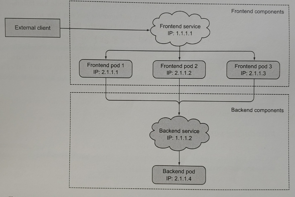 위 사진은 쿠버네티스 인 액션에서 발췌한 사진이다. External Client(외부 고객) 입장에서는 프론트엔드 서비스의 아이피만 만 알면 뒷편에 위치한 프론트엔드 포드의 수와 아이피를 몰라도 요청을 할 수 있다.